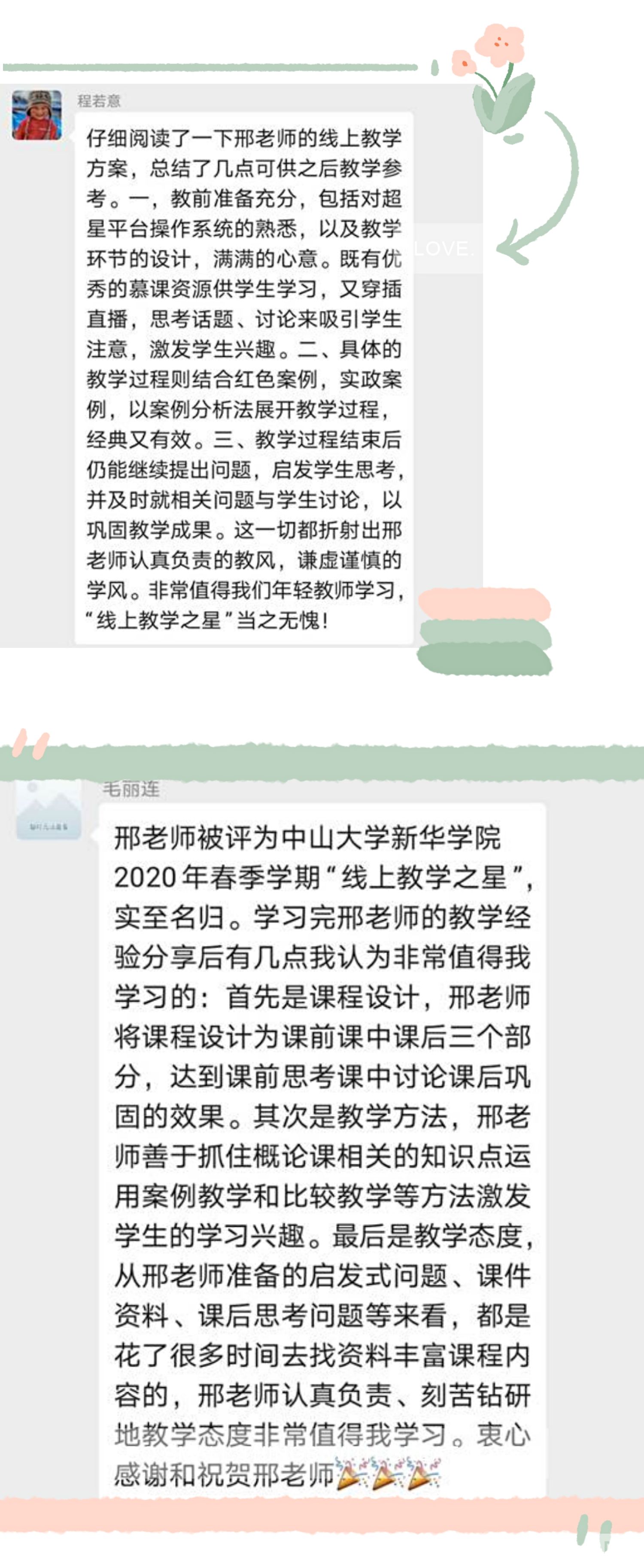 自5月15日以来,我院教师持续关注中山大学新华学院校网/微信公众号“线上教学之星”事迹专栏,进入“线上教学之星”课堂观摩学习,6月3日由学院副院长吴素香教授主持,全院教师在微信群积极分享了学习心得。