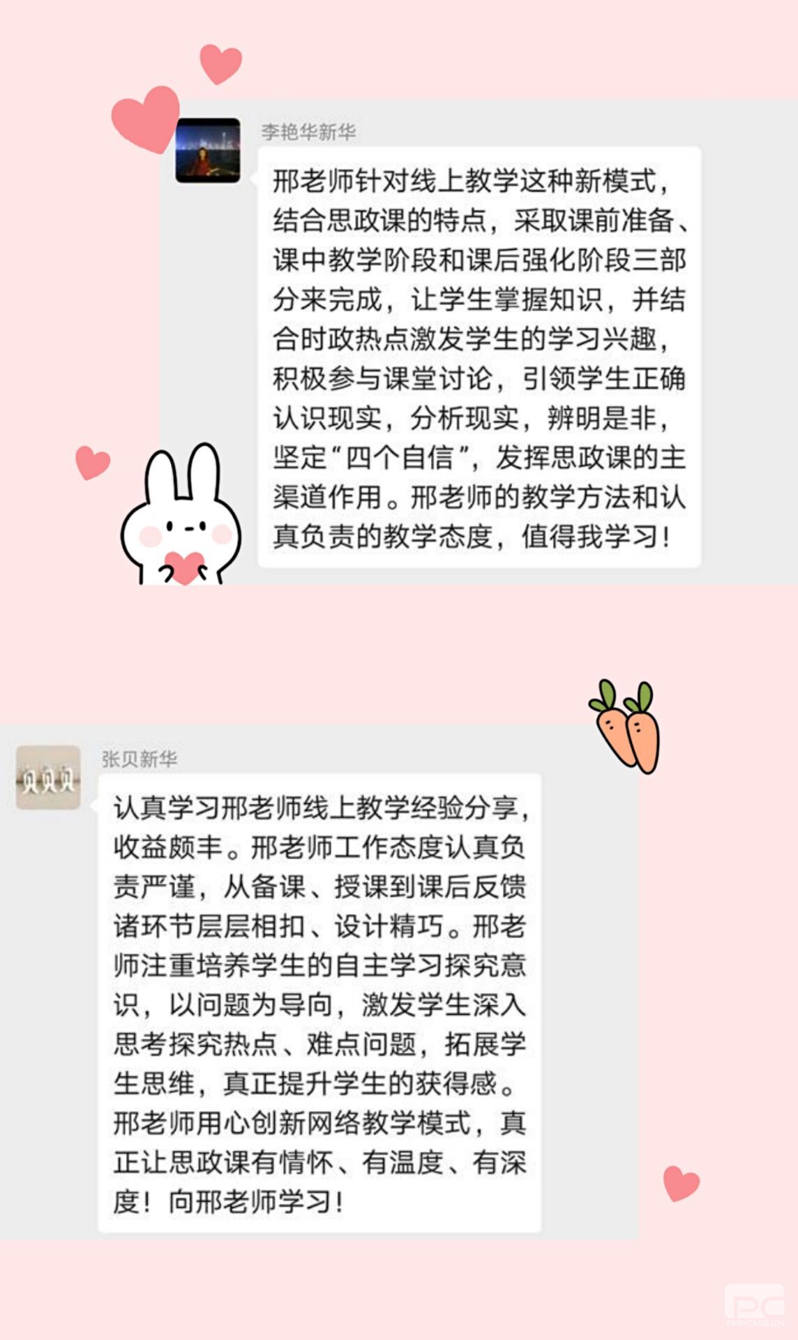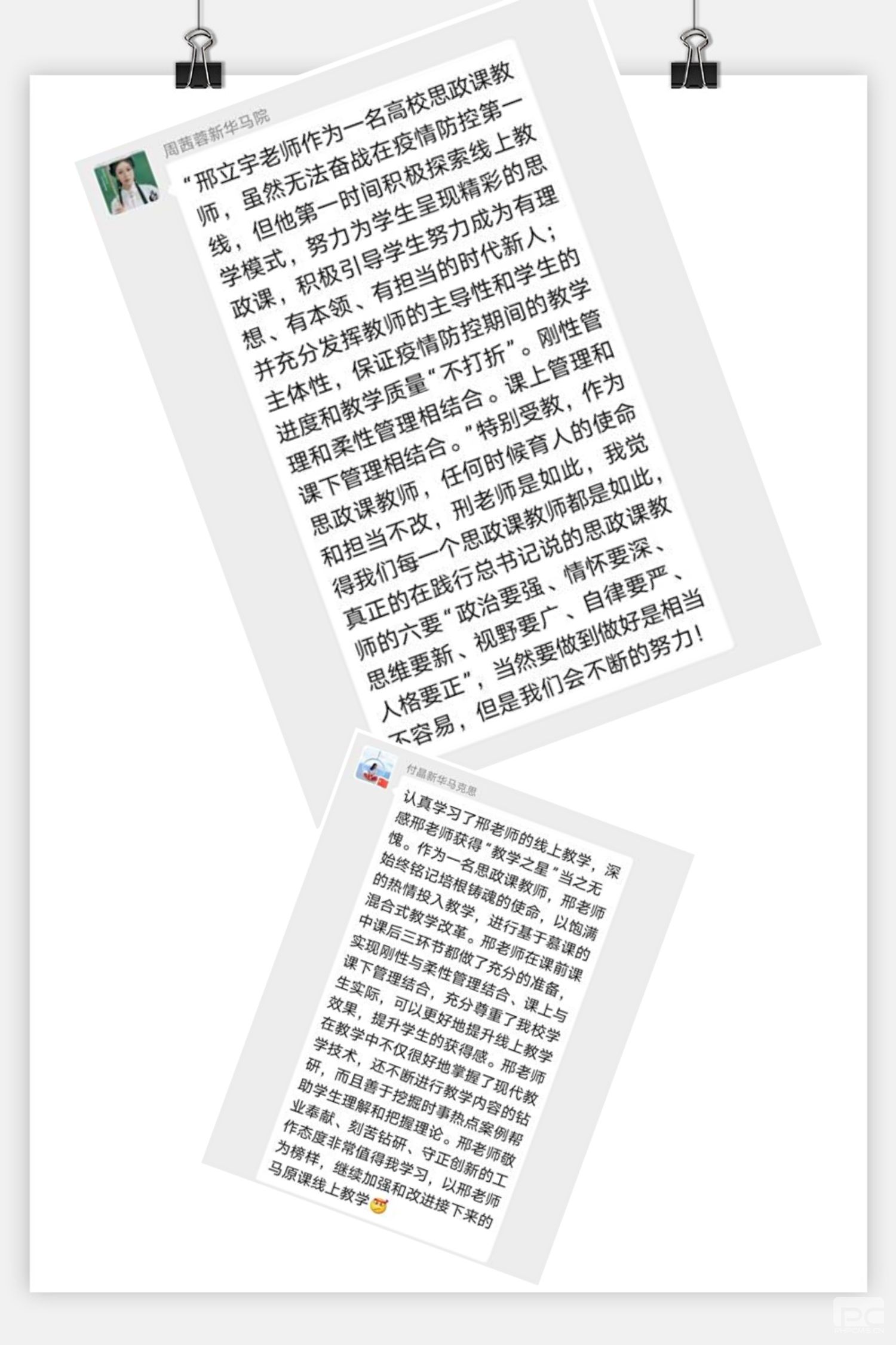我院刘亚军老师表示,学习完各位优秀教师的教学经验,为他们的认真细致所折服,其实能有这样的教学成果完全是因为他们认真负责的教学态度,这种态度才是最应该学习的。祝艳老师表示,各位老师能够积极探索和创新线上教学新模式,全身心投入到教学中,用实际行动诠释了立德树人和铸魂育人的使命任务。从他们身上我深切体会到一名教师的责任和担当。刘黎老师表示,认真学习了各位老师的线上教学经验,受益匪浅,他们的网络教学方式非常丰富多样化,不仅有优质的慕课视频和课件提供给学生学习,而且充分发挥教师的主导作用,通过直播,讨论,作业等形式将课堂知识教授给学生,激发学生的学习思政课的兴趣,让学生能够更好的消化吸收知识,完成网络教学的教学目的。作为一名新教师,更要学习这种认真负责,刻苦钻研的精神,提升自己的教学水平,才能更好的教导学生。赵芸老师表示,通过学习各位老师的教学经验分享,收获颇丰。首先,邢老师的对待教学工作严谨负责的态度值得我学习;其次,邢老师在教学过程中融入伟人故事、红色故事等专题教学和案例教学,以故事激发学生兴趣,活跃课堂气氛,使学生更容易更深刻的掌握课堂知识;最后,邢老师在课上设置了精确的时间点和任务点,课下管理则是对学生的评论区回复和作业进行及时的评阅和批改,及时指出学生在完成课后任务中存在的问题。这种课上管理与课下管理相结合的方式来指导学生,巩固教学成果,也让我受益匪浅。