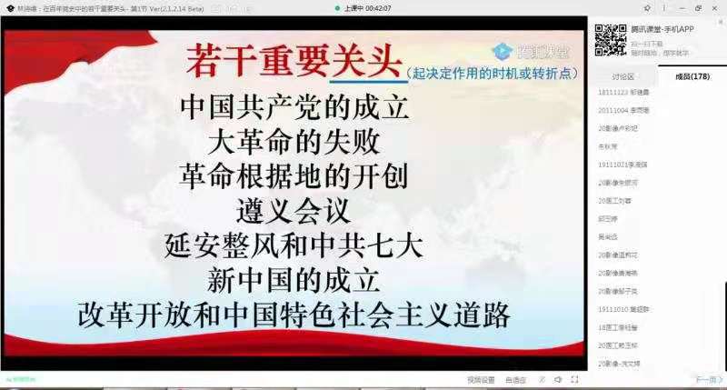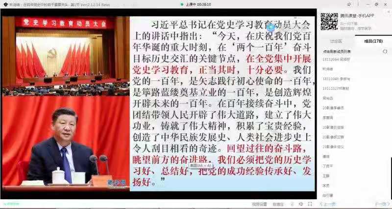 2021年6月16日晚19:30,我院林诗维老师在腾讯课堂为生物医工学院作了题为《在百年党史中的若干重要关头》的专题讲座,该讲座梳理了百年党史上的几个重要关头,从中国共产党的成立为起点,在百年党史的视域下,沿着时间线索,着重讲述了党的成立、大革命的失败、革命根据地的开创、遵义会议、延安整风和中共七大、新中国的成立、改革开放和中国特色社会主义道路等在党的百年历史中具有历史性转折的重大事件,分析了其形成的原因和重大意义,从而突出了党这一百年的光辉历程,也进一步为今后的征途提供了经验和借鉴,让学生们重温百年党史。