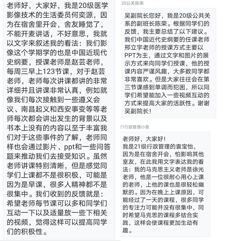 会议的主题是听取学生们对我院本学期开设的三门课程的意见和建议 ,学生们发言踊跃,态度诚恳,对本学期的上课教师做出了肯定的评价,如教学态度认真,理论分析清楚,材料丰富,讲述生动,从老师们的教学中收获不少。此外,学生代表们对教学提出了许多意见和建议,如授课时加强互动与讨论环节,激发学生学习兴趣,创新教学形式;也有同学反映了任课教师在教学中缺乏互动。