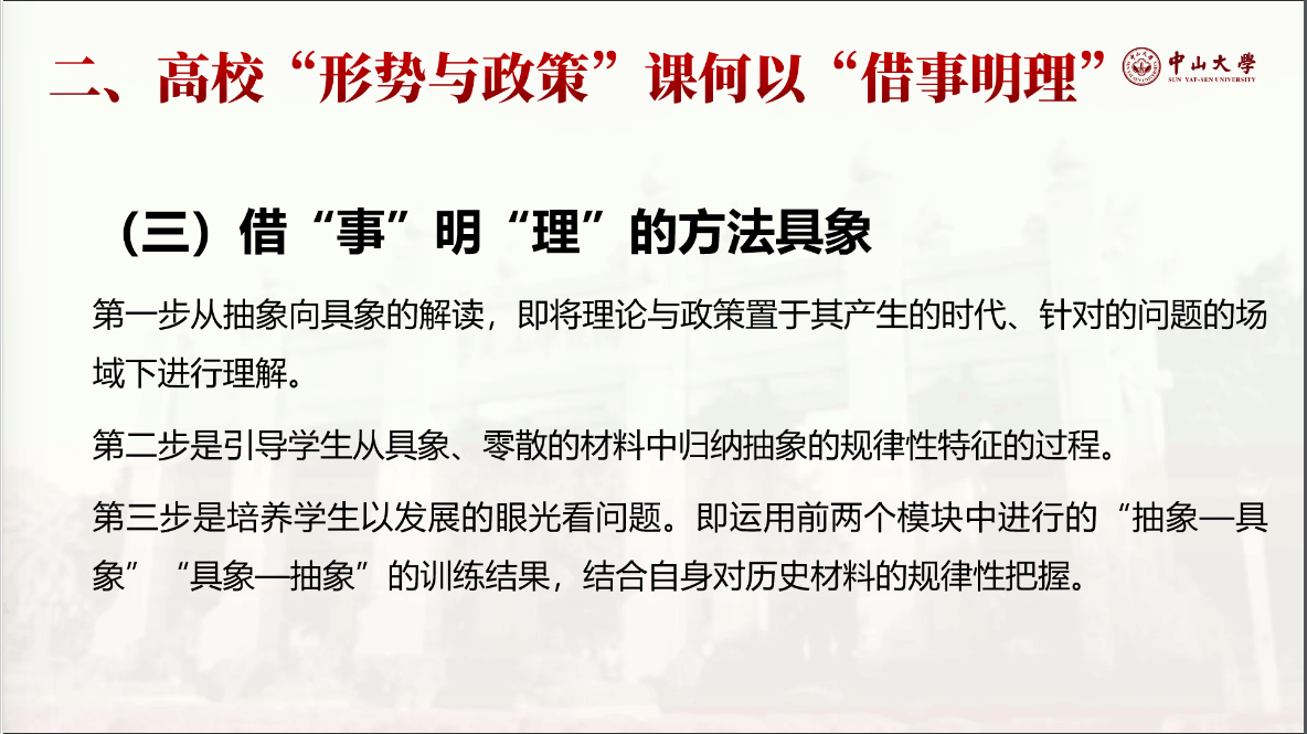 会上,詹小美教授以“高校形势与政策课何以‘借事明理’”为题向老师们讲授了在形势与政策课教学实践中如何“借事明理”的重要方法。首先,詹教授从宏观的角度分析了形势与政策课“为何”和“何为”“借事明理”,阐明了“借事明理”的丰富内涵和基本要求。然后,詹教授重点从三个方面阐述了形势与政策课何以“借事明理”。一要澄清“事”,教师要对学生讲清“时”(即时局时事)、“势”(即发展趋势)、“事”(即事件活动会议);二要讲透“理”,教师要对学生讲透国家的大政方针,讲透事物的客观规律;三是“借事明理”的具体方法步骤,教师先要把抽象理论政策进行具象解读,带入到具体的情景、人物和事件中,再引导学生从具象、零散的材料中归纳抽象的规律性特征,进行抽象总结,最后上升到对历史发展大势的规律性把握。