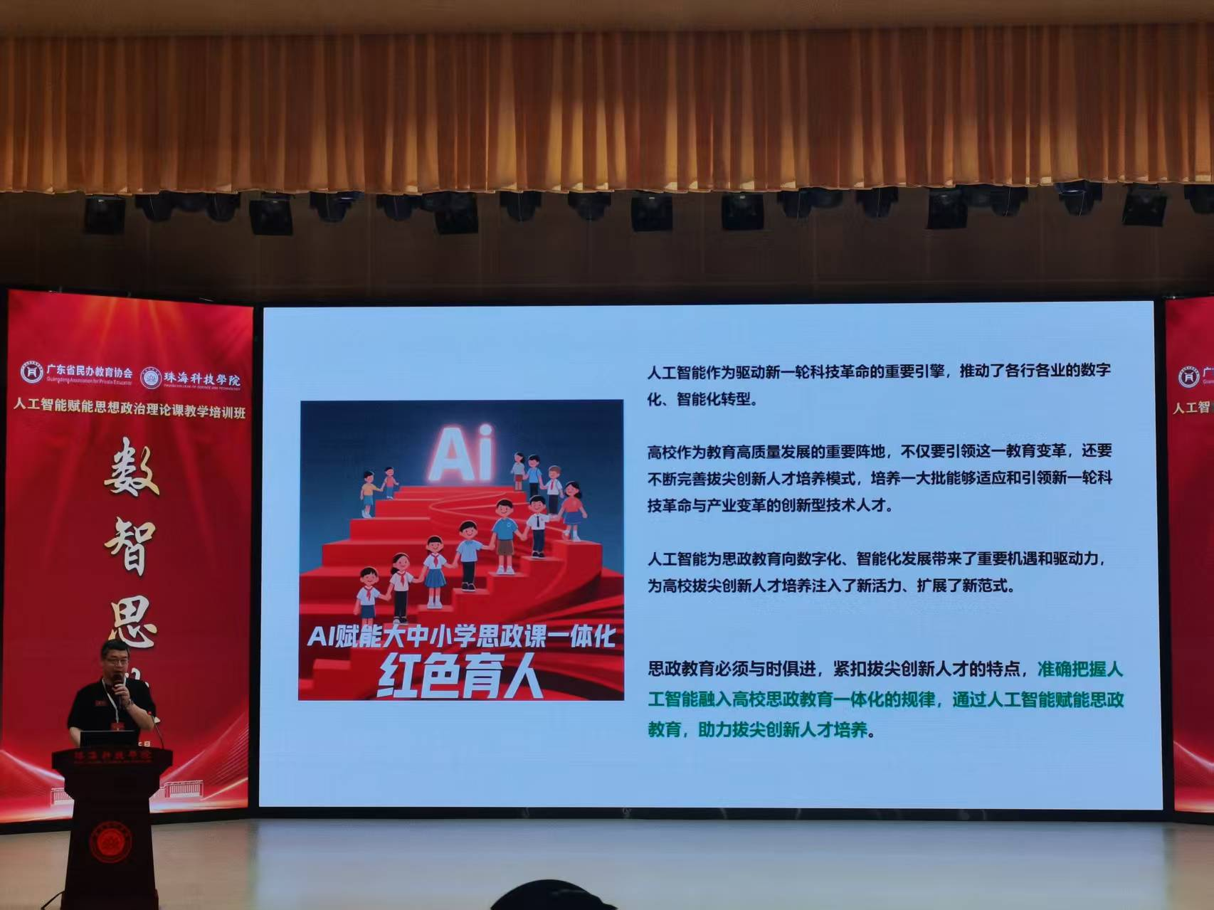 为深入贯彻党的二十届三中全会精神和全国教育大会精神,全面落实《教育强国建设规划纲要(2024—2035 年)》, 促进新时代广东省高校思政课协同创新,推动人工智能赋能 思政课教学,2025年5月23日至24日,9428cn太阳集团古天乐共5名骨干教师赴珠海科技学院参加人工智能赋能思想政治理论课专题培训,此次培训由学院副院长卢诚、付晶带队。