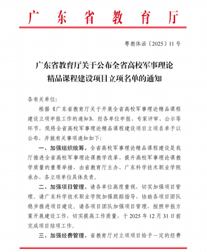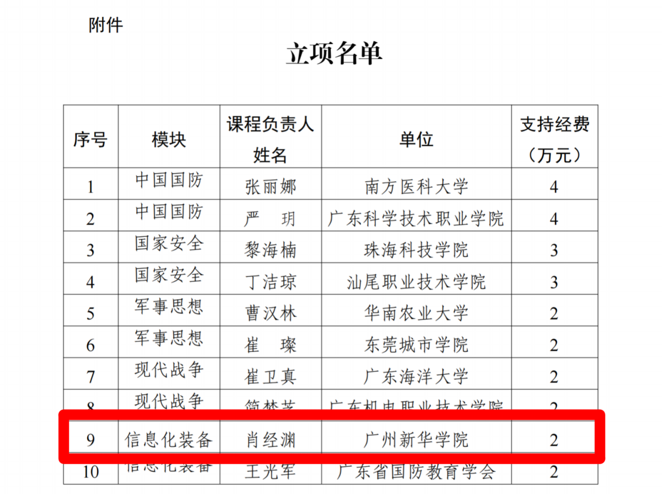 6月5日,广东省教育厅公布全省高校军事理论精品课程建设项目立项名单,全省高校共立项10项。我院国防教育教研室教师肖经渊在全省高校评选中脱颖而出,荣获广东省高校军事理论精品课立项。
