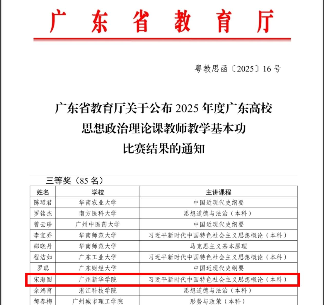 近日,广东省教育厅下发《关于公布2025年度广东高校思想政治理论课教师教学基本功比赛结果的通知》(粤教思函〔2025〕16号),我院教师宋海圆在《习近平新时代中国特色社会主义思想概论》课程中的精彩讲授,荣获比赛三等奖,彰显了我院思政课教师的卓越风采。