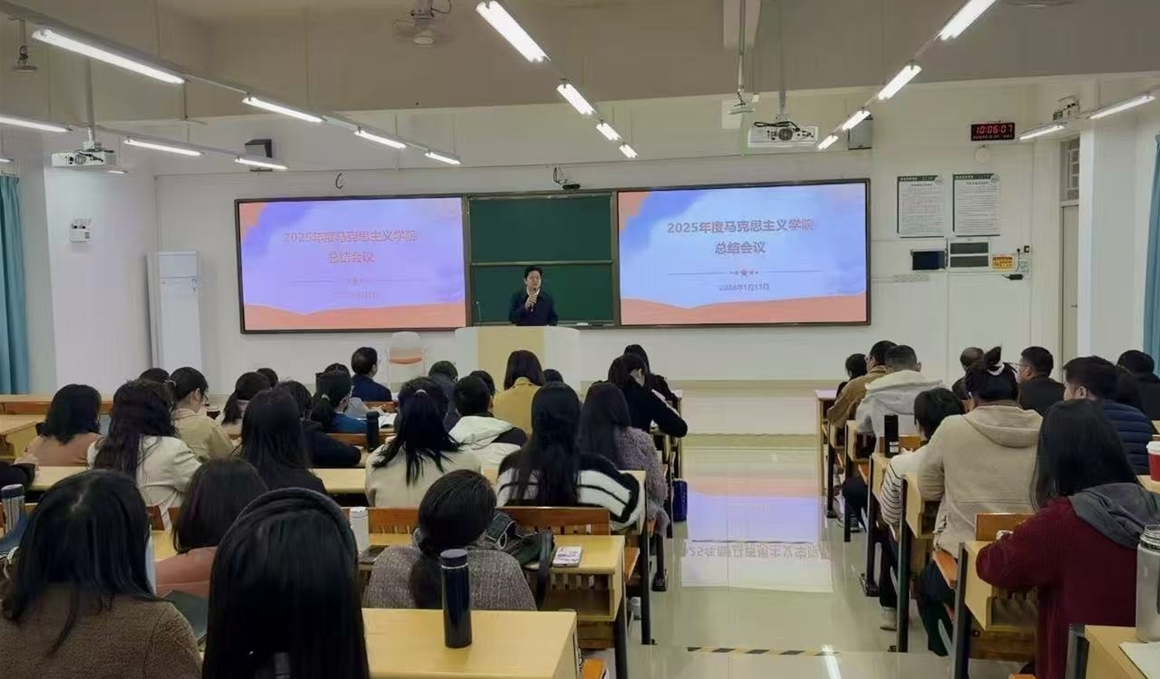 为全面总结2025年工作成效,系统部署2026年教学工作,1月13日下午14:00,9428cn太阳集团古天乐在定静③219召开2025年度工作总结会议。马院副院长卢诚作2025年度工作报告,党总支书记付晶作党建工作总结报告。学校党委书记郝登峰出席会议并作指导讲话,学院全体教职工参加会议,会议由卢诚副院长主持。